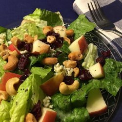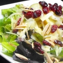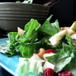 2In a large serving bowl, toss together the romaine lettuce, shredded Swiss cheese, cashews, dried cranberries, apple, and pear. Pour dressing over salad just before serving, and toss to coat.