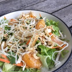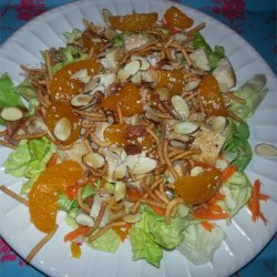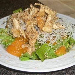 "A perfect salad for leftover BBQ, boiled, broiled or baked chicken. A very crunchy salad with a tasty sweet Asian-style dressing. The kids love it too! The Chinese rice noodles are of the cellophane type and can be found in the Asian section of most grocery stores. They are often in rectangle form and in clear packaging."