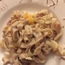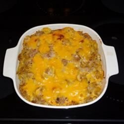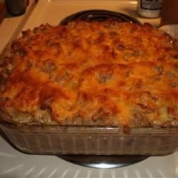 3In a large bowl, mix together soup, milk, corned beef hash, onion, salt, pepper and noodles. Spoon into prepared casserole and sprinkle with cubed cheese.