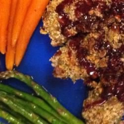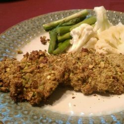 2Mix together pistachios and bread crumbs in a shallow bowl. In a separate bowl, stir together Dijon mustard, olive oil, honey, salt and pepper until smooth. Dip chicken into Dijon mixture to coat, then coat with bread crumbs. Place onto prepared baking sheet.