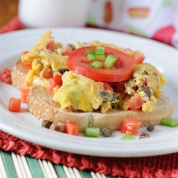 2Pour beaten eggs over vegetable mixture; cook and stir until eggs are scrambled and no longer runny, about 5 minutes. Spoon egg mixture over toast.