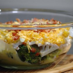 In a medium sized salad bowl, layer in order the broccoli, cauliflower, eggs, cheese and bacon.