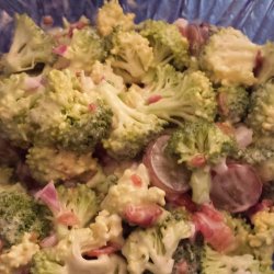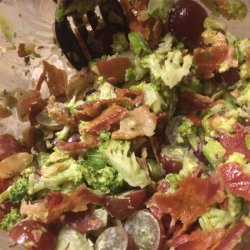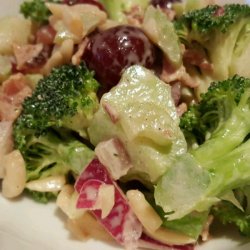 4In a large bowl, combine broccoli, crumbled bacon, celery, green onions, red onions, grapes, and toasted almonds. Toss with mayonnaise dressing. Chill for several hours in the refrigerator.