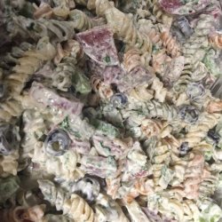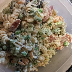 3In a large salad bowl combine cooked and cooled pasta, peas, olives, salami, green onions, celery and parsley. Mix in dressing last, reserving 1/2 cup. Let sit overnight in fridge. Stir before serving. Add extra dressing if pasta appears dry.