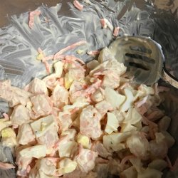"Shrimp with chopped celery, onions, hard-boiled egg, shredded carrots, and mayonnaise."