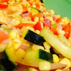 Husk the corn and slice the kernels from the cob. In a large bowl, mix together the corn, tomato, zucchini, cucumber, onion and red bell pepper. Pour dressing over vegetables and toss to coat. Refrigerate until chilled, at least 1 hour.