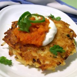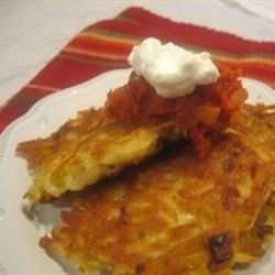 3Drop potato mixture into hot oil by the heaping tablespoon. Flatten slightly, and cook until golden brown on both sides, about 2 minutes per side. Drain on paper towels, and continue with remaining potato mixture. Serve the potato pancakes with sauce spooned overtop.