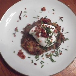 2Heat the vegetable oil in a large skillet over medium heat until it shimmers, and drop the potato mixture by heaping tablespoons into the hot oil. Press down on the patties to flatten them to about 1/3 inch thick. Fry the patties until golden brown and crisp on the bottoms, 5 to 8 minutes, then flip and cook the other side until crisp and golden. Remove the latkes to paper towels to drain, and serve hot, sprinkled with green onion and a small dollop of sour cream.