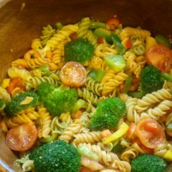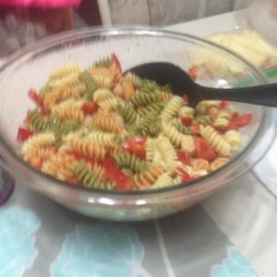In a salad bowl, combine the pasta, cherry tomatoes, bell peppers and olives. Pour dressing over salad; toss and refrigerate overnight.