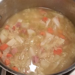 Place the chicken broth, celery, carrots, onion, garlic, cabbage, barley, ham and parsley in a large pot over high heat. Bring to a boil, reduce heat to low and simmer for 1 1/2 hours.