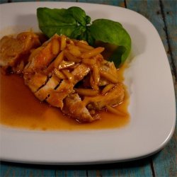 3To skillet add jelly, mustard, almonds, sugar, juice and cinnamon. Stir together and cook over medium heat, stirring constantly, until jelly dissolves. Pour mixture over chicken.