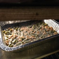 2In a medium casserole dish mix together green beans, milk, cream of mushroom soup, and 1/2 of the can of onions.