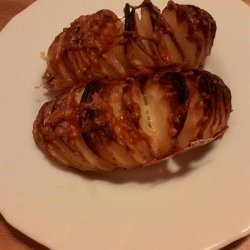2Peel the potatoes, and place in bowl of cold water to prevent browning. Place potatoes into a large wooden or metal spoon. Using a sharp knife, make slices across the potato the short way about 1/8 to 1/4 inch apart, making sure to cut down to the lip of the spoon, not all the way through the potato. The slices should stay connected at the bottom, and the spoon helps keep the depth even. Return the potato to the bowl of water, and proceed with the remaining potatoes.