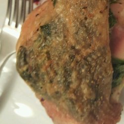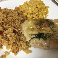 1Stuff spinach leaves, arugula, and garlic under the skin of the chicken thigh and place on a baking dish. Sprinkle with seasoned salt.