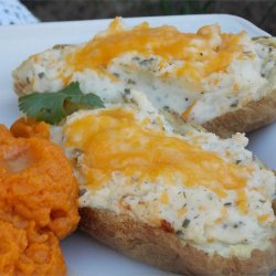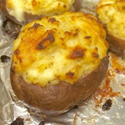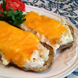 3Cut potatoes in half lengthwise; remove pulp, leaving a thin potato skin shell. Mix pulp into cheese mixture and mash. Spoon mixture into potato shells; sprinkle with Cheddar cheese.