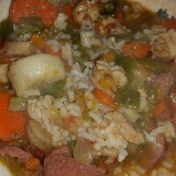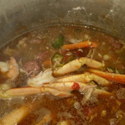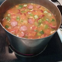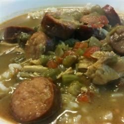 3As soon as the roux has reached the desired color, stir in the onions, bell peppers, celery, Cajun seasoning, and bay leaves, and simmer, stirring occasionally, until the vegetables are tender, about 45 minutes. Pour in the reserved chicken broth, diced tomatoes, and beef sausage, and simmer, stirring occasionally, until the mixture has thickened, about 1 hour.