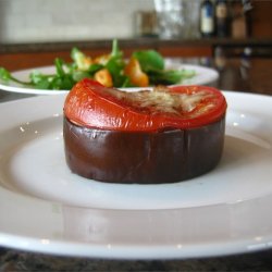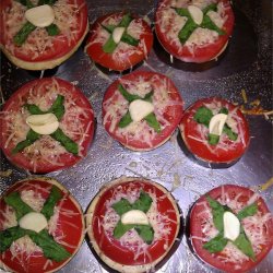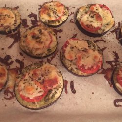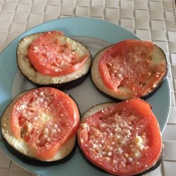 Spray a cookie sheet with non-stick oil spray. Arrange eggplant rounds on the cookie sheet and sprinkle Parmesan over the eggplant. Layer one slice of tomato on top of each eggplant round. Sprinkle with Parmesan cheese.