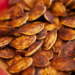 3Spread pumpkin seeds out in a single layer on the prepared baking sheet. Sprinkle sugar, cinnamon, and ginger evenly over seeds.