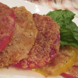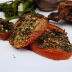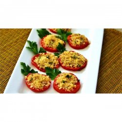 2Place tomato slices close together in prepared baking dish. Sprinkle with cheese, bread crumbs, garlic, parsley, salt, pepper, and oregano. Drizzle with olive oil.