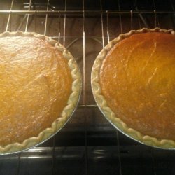 4Peel hot potatoes--with knife, cut top and peel down, removing any stringiness from the potato with the skin, cut bottoms. Place hot, peeled potatoes on the butter in the bowl with sugar, crush together. Add beaten eggs. Stir in spices (to taste). Pour into 2 unbaked pie crusts. Should be the consistency of pumpkin pie mix.