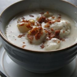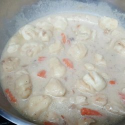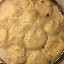 3Pour in half-and-half and bring to a boil; add crumbled bacon. In a medium bowl, combine biscuit mix with milk and mix well (dough should be thick). Drop tablespoon sizes of dough into boiling mixture; reduce heat and simmer for 10 minutes uncovered, then another 10 minutes covered. (Note: Do not stir while simmering, or dumplings will break apart). Serve hot.