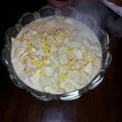 2Add potatoes, onion and chicken to bacon drippings and cook for 15 minutes, stirring occasionally. Pour in chicken broth; season with poultry seasoning, salt and pepper. Stir in corn, and simmer all together for 15 minutes.