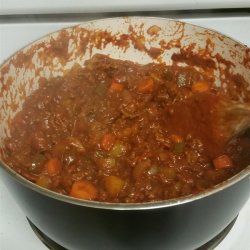 1In a large pot over medium-low heat, combine tomatoes, tomato paste, carrot, onion, celery, wine, pepper flakes, bell peppers and steak sauce.