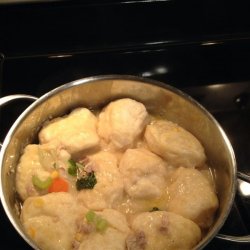 4Tear each buttermilk biscuit into quarters and drop into the chicken stew. Reduce heat to medium-low; stir occasionally until dough is cooked though, forming dumplings at the top of the stew, about 10 minutes. Remove from heat and serve with a garnish of crumbled bacon.