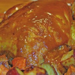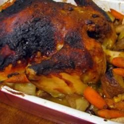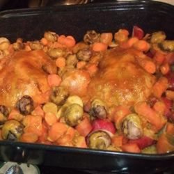5Drain the drippings from the roasting pan. Arrange the potatoes, carrots, mushrooms, and apples around the chicken. Drizzle the chicken and vegetables with the honey mixture. Continue roasting 20 minutes, or until the glaze has browned. The chicken meat should reach an internal temperature of 180 degrees F (85 degrees C).