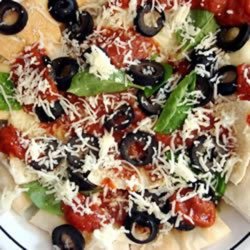 4Transfer pita chips to a serving platter, sprinkle with olives, and pour sauce over them. Quickly cover with shredded mozzarella cheese, and whole basil leaves. Serve immediately.