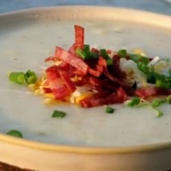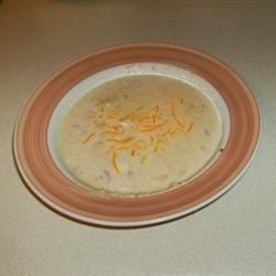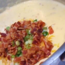 "This is the MOST simple and delicious potato soup recipe ever! Creamy and cheesy! Top with shredded cheese (your favorite kind), chopped scallions and cooked bacon bits."