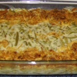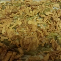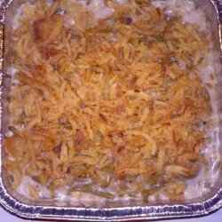 2In a large bowl, mix the green beans with the soup and milk. Gently stir in half the French fried onions. Transfer to a non-greased 9x13 inch baking dish, and season with salt and pepper. Top with remaining French fried onions.