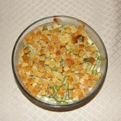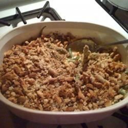 2Saute; onions in a large frying pan. Add flour, stir. Gradually add milk, bring to a boil. Add cheese, sour cream, sugar, and salt. Cook till thickened and cheese is melted. Pour mixture over green beans. Top with stuffing mix.