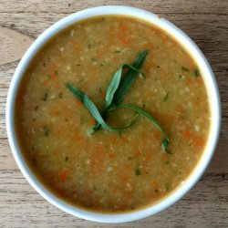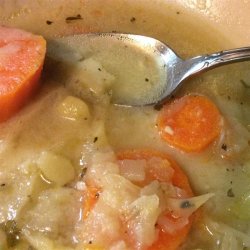 1Combine the carrots, potatoes, onion, cabbage, garlic, chicken stock, olive oil, thyme, basil, parsley, salt, and pepper in a stock pot over medium-high heat; bring to a simmer and cook until the carrots are tender, about 20 minutes. Transfer to a blender in small batches and blend until smooth.