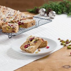 2Beat Becel Buttery Taste margarine with sugars in large bowl. Beat in eggs and vanilla until blended. Gradually add in flour mixture; beat just until blended. Stir in cinnamon and ginger. Spread into prepared baking pan. Combine chips, cranberries and pistachios in small bowl. Evenly sprinkle over dough; press gently.