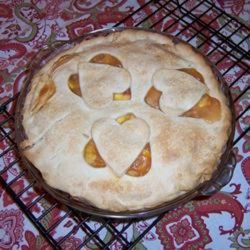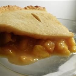 "Fresh peaches in a pre-cooked pie crust with a filling of lemon and orange juice, sweetened and thickened. Top with whipped cream. Filling can also double as cake filling."