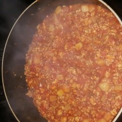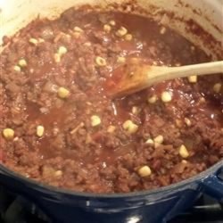 "My husband won't eat beans but LOVES chili, so I had to come up with this variation on an old favorite. Instead, it contains lots of canned tomatoes and onion. This is great served over rice with some shredded cheese and a dollop of sour cream. Ground turkey may be substituted for ground beef."