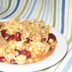 Stir in the corn, kidney beans, and tomato soup. Stir in the cooked egg noodles and mix thoroughly.