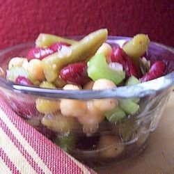2In a large bowl, combine the green beans, wax beans, kidney beans, onion and green pepper. Pour the cooled dressing over all and toss to coat. Best if marinated for at least an hour before serving. Yummy!