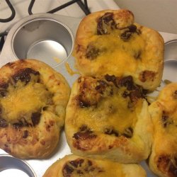 3Roll out each biscuit on a floured surface so that each biscuit is 6 inches across. Put the biscuit in the muffin tin and fold up sides to create a cup shape. Fill each biscuit fill almost to the top with the meat mixture; top with cheddar cheese.