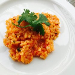 3Stir rice into onion mixture and cook, stirring often, until rice is lightly toasted, about 3 more minutes. Stir grated tomato, chicken broth, and tomato sauce into the rice. Bring mixture to a boil.