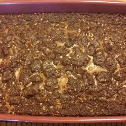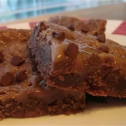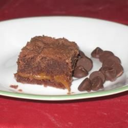 5Sprinkle the chocolate chips evenly over the partially cooked brownies. Pour the melted caramel mixture over the top and with a teaspoon drop the remaining 1/2 of the batter evenly over the top.