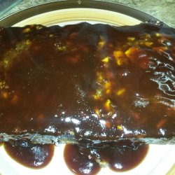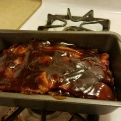 3Bake in the preheated oven until no longer pink in the center and the bacon is crispy, about 35 minutes. An instant-read thermometer inserted into the center should read at least 160 degrees F (70 degrees C). Meanwhile, stir 3/4 cup barbecue sauce, 2 tablespoons brown sugar, and 1 tablespoon Worcestershire sauce in a sauce pan over medium heat. Simmer 5 minutes, whisking constantly. Pour the sauce over the cooked meatloaf, and let rest 5 minutes before serving.