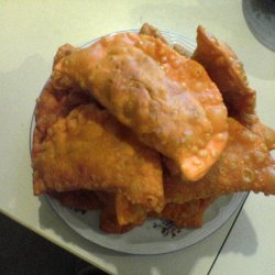 5Roll out pastry and cut 32 3-inch circles. Place a heaping tablespoon of filling on one half of each circle. Fold pastry in half and crimp edges with a fork. Place empanadas on a baking sheet and brush each one with beaten egg.