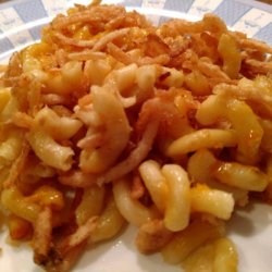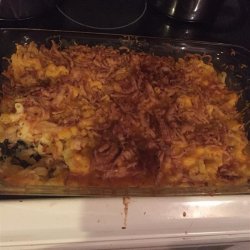 Bake at 350 degrees F (175 degrees C) for about 25 minutes, or until bubbly. Sprinkle with fried onions, and bake for another 5 minutes. Serve hot.