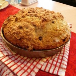 2Stir together the flour, sugar, salt, baking powder, and baking soda in a large bowl. Using a pastry cutter, cut the butter gently into the flour mixture until well combined, and stir in the raisins. In another bowl, whisk the buttermilk and eggs together; lightly beat the buttermilk mixture into the flour mixture. Place the dough into the prepared cake pan.
