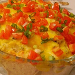 3Spread tortilla chips into the prepared pan; top with Mexican cheese-tomato mixture. Sprinkle sharp Cheddar cheese on top.