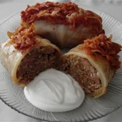 2Bring a large pot of water a boil. Separate 12 to 15 large cabbage leaves from the head, and place in boiling water. Boil until soft, approximately 2 to 3 minutes. Remove from water, and set aside.
