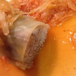 4Place a layer of sauerkraut in the bottom of a large pot. Arrange cabbage rolls in a single layer over the sauerkraut. Cover with remaining sauerkraut. Pour in enough water to cover the rolls. Bring to a boil, lower heat, and simmer for 90 minutes.