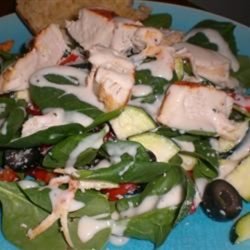 1Place equal portions of spinach onto four salad plates. Arrange chicken, zucchini, bell pepper, and black olives over spinach, and top with cheese. Drizzle dressing over salad.